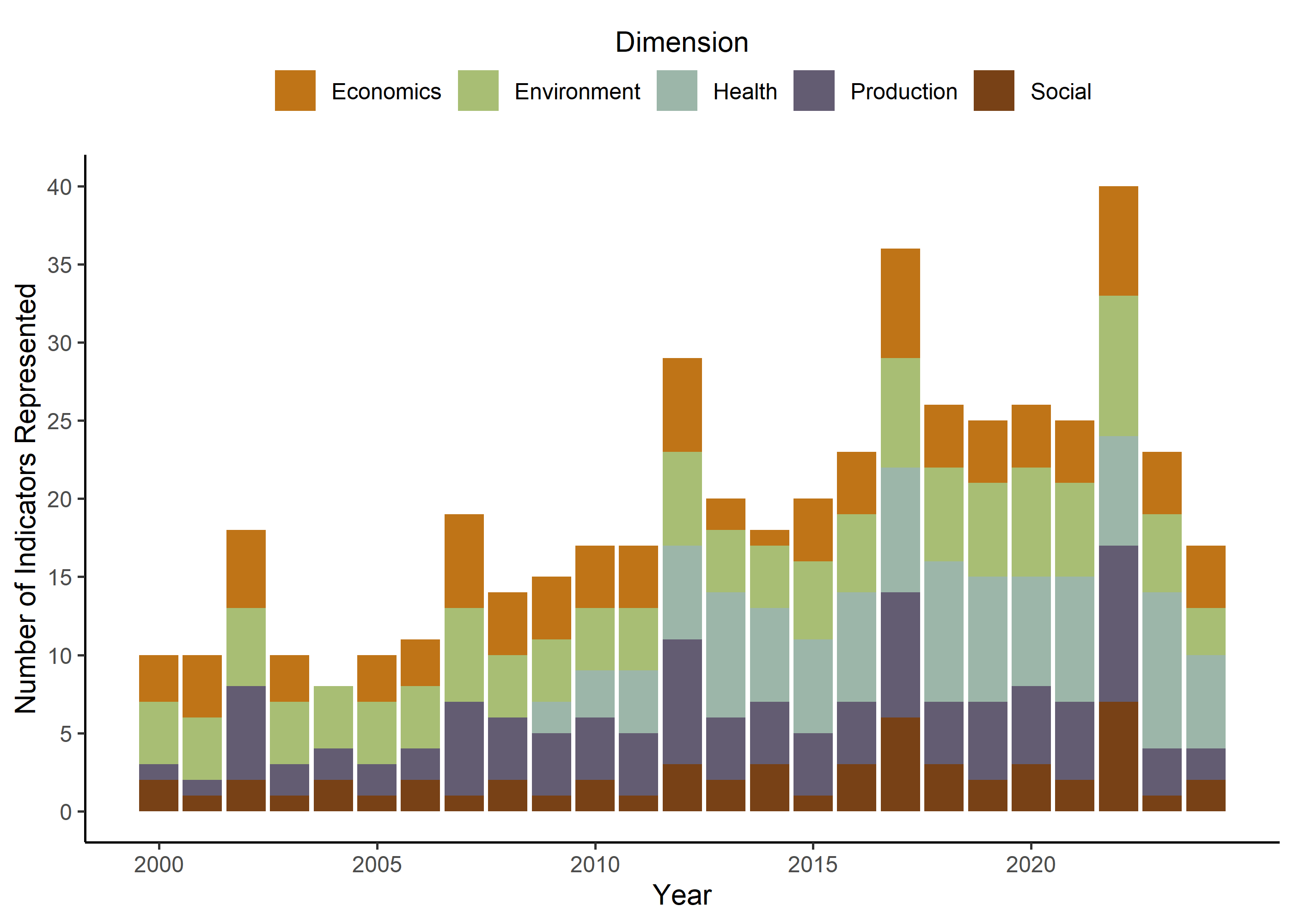 Here we show the total number of indicators represented each year, colored by dimension. We can see the growth in represented indicators over time, as well as the 5-year update cycle of NASS and the American Community Survey. Credits to Isabella Loconte on this graph!