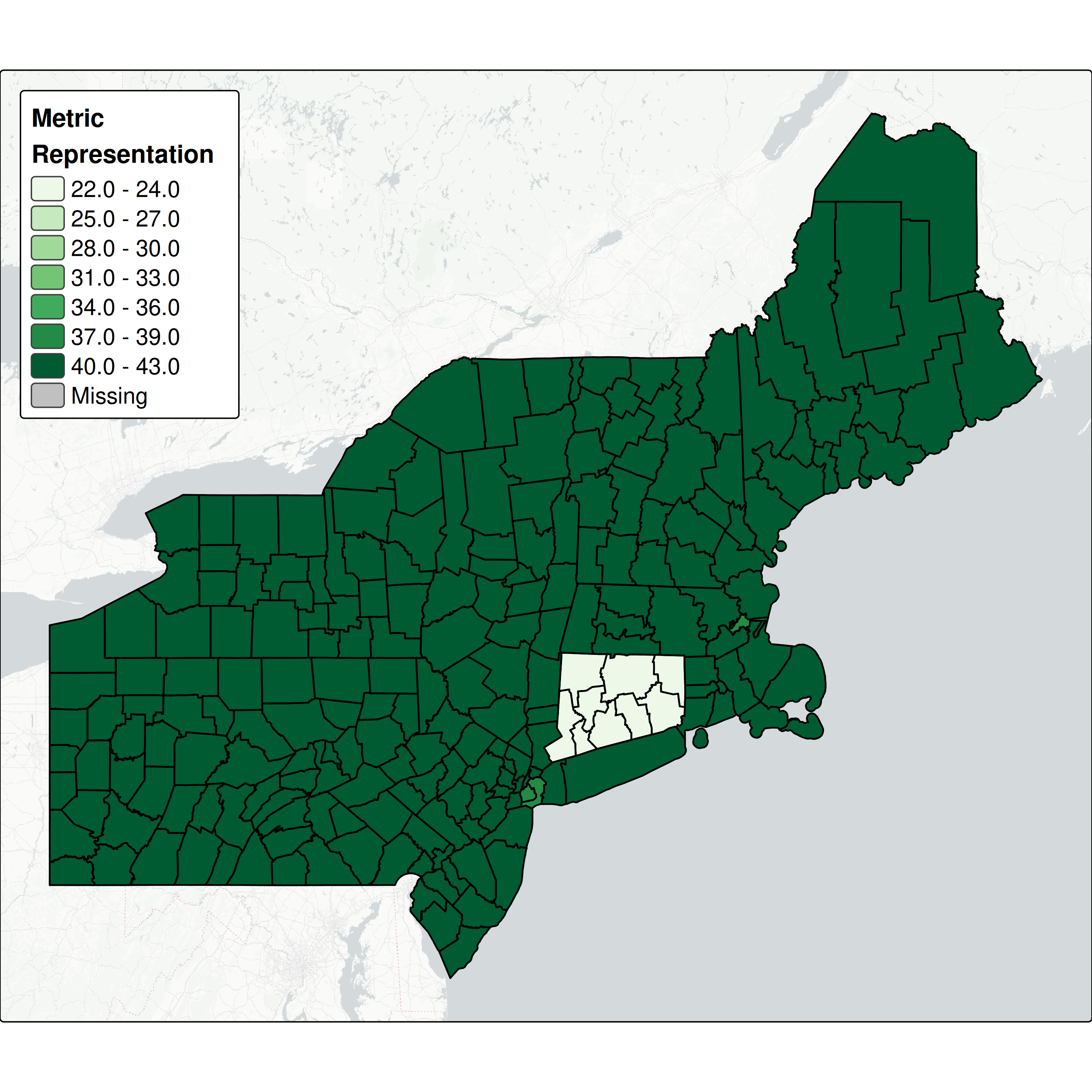## Get bounding box - commenting out to avoid downloading this each time# would be better off caching though# bbox_new <- st_bbox(neast_counties_2024)# xrange <- bbox_new$xmax - bbox_new$xmin # range of x values# yrange <- bbox_new$ymax - bbox_new$ymin # range of y values# # bbox_new[1] <- bbox_new[1] - (0.05 * xrange) # xmin - left# bbox_new[3] <- bbox_new[3] + (0.05 * xrange) # xmax - right# bbox_new[2] <- bbox_new[2] - (0.05 * yrange) # ymin - bottom# bbox_new[4] <- bbox_new[4] + (0.05 * yrange) # ymax - top# # tiles <- get_tiles(# bbox_new,# provider = "CartoDB.PositronNoLabels",# zoom = 7,# crop = TRUE# )# terra::saveRDS(tiles, 'data/data_paper/neast_tiles.rds')# Load tiles for backgroundtiles <- terra::readRDS('data/data_paper/neast_tiles.rds')# Counts of unique metrics in each county# var_counts <- datasets$dp_metrics_all %>% var_counts <- dp_metrics_county %>%group_by(fips) %>%summarize(n_metrics =length(unique(variable_name)))# Join df <- neast_counties_2024 %>%left_join(var_counts)tmap_mode('plot')map <-tm_shape(tiles) +tm_rgb() +tm_shape(df) +tm_polygons("n_metrics", palette ="brewer.greens",title ="Metric\nRepresentation",breaks =c(seq(22, 43, 3)),breaks =seq(min(var_counts$n_metrics), max(var_counts$n_metrics), 5),fill.legend =tm_legend(reverse =TRUE ) ) +tm_borders(col ='black', lwd =1.25) +tm_layout(legend.position =c('left', 'top'),legend.title.fontface ='bold',legend.width =8,legend.height =12,legend.title.size =1.1,inner.margins =rep(0, 4),outer.margins =rep(0, 4),legend.text.size =1 )# tmap_save(# tm = map,# filename = 'outputs/metric_coverage_map.png',# asp = 0,# dpi = 300# )